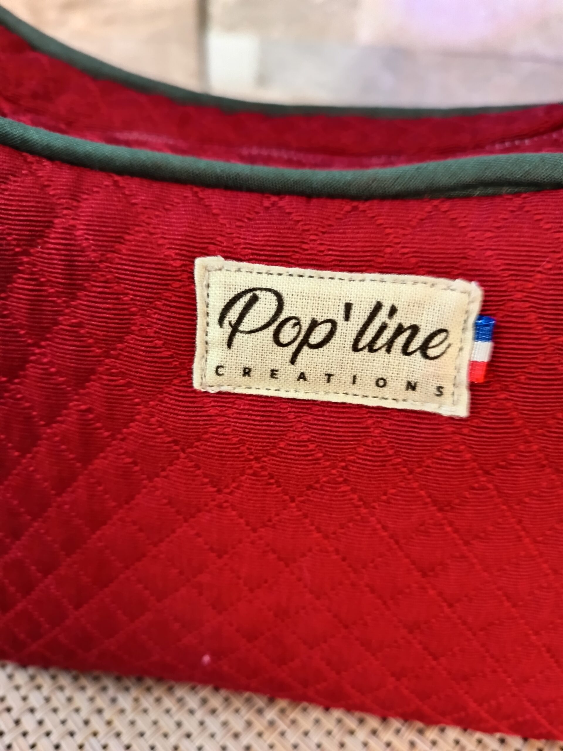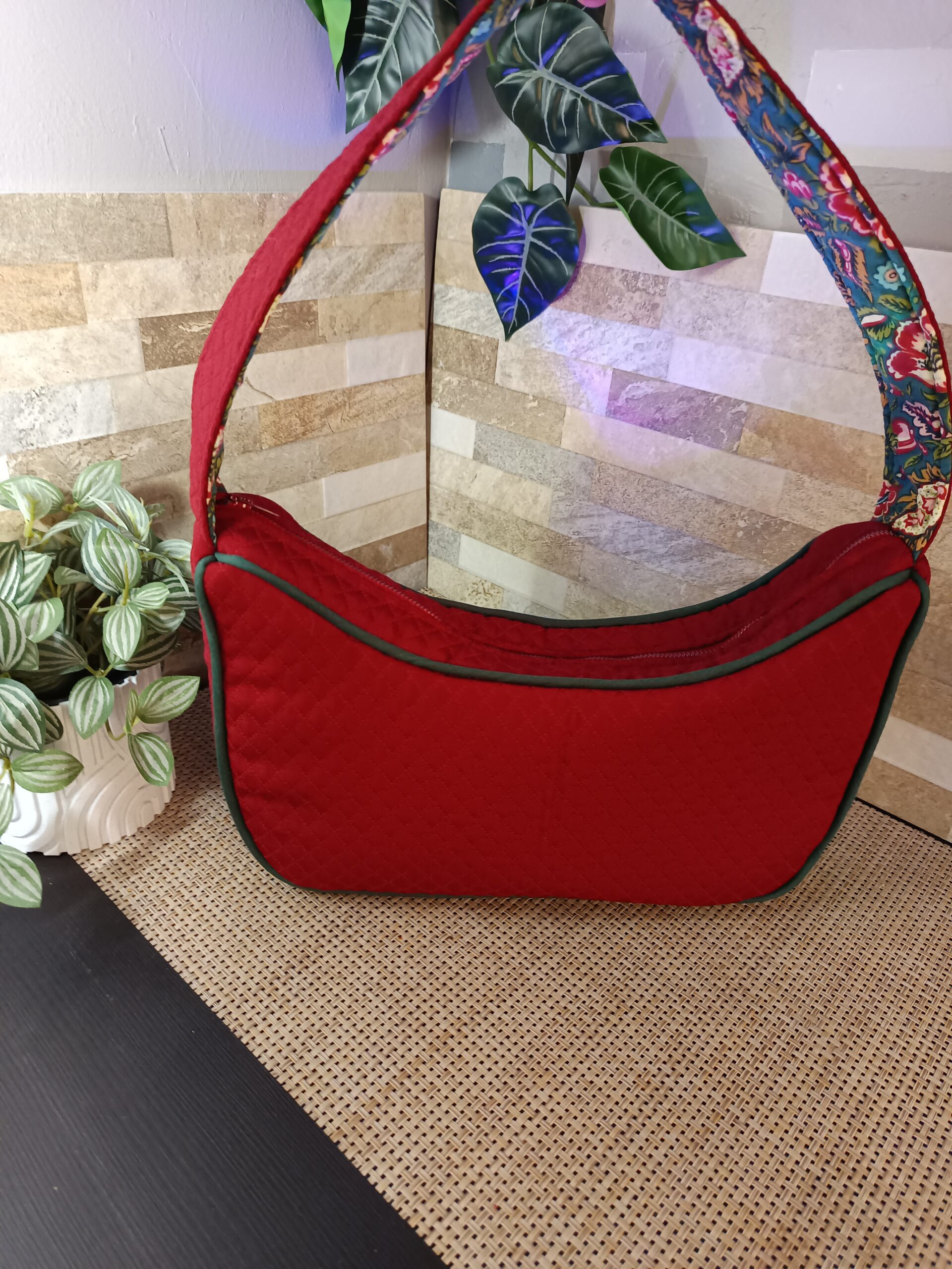 Petit sac de ville très structuré qui a une bonne tenue grâce à ses renforts. Il est bordé d’un passepoil assorti qui lui donne son chic, finition couture. Il est entièrement doublé en coton fantaisie et comporte une poche plaquée sur un côté intérieur. Confectionné dans un piqué rouge, il est lavable en machine.
