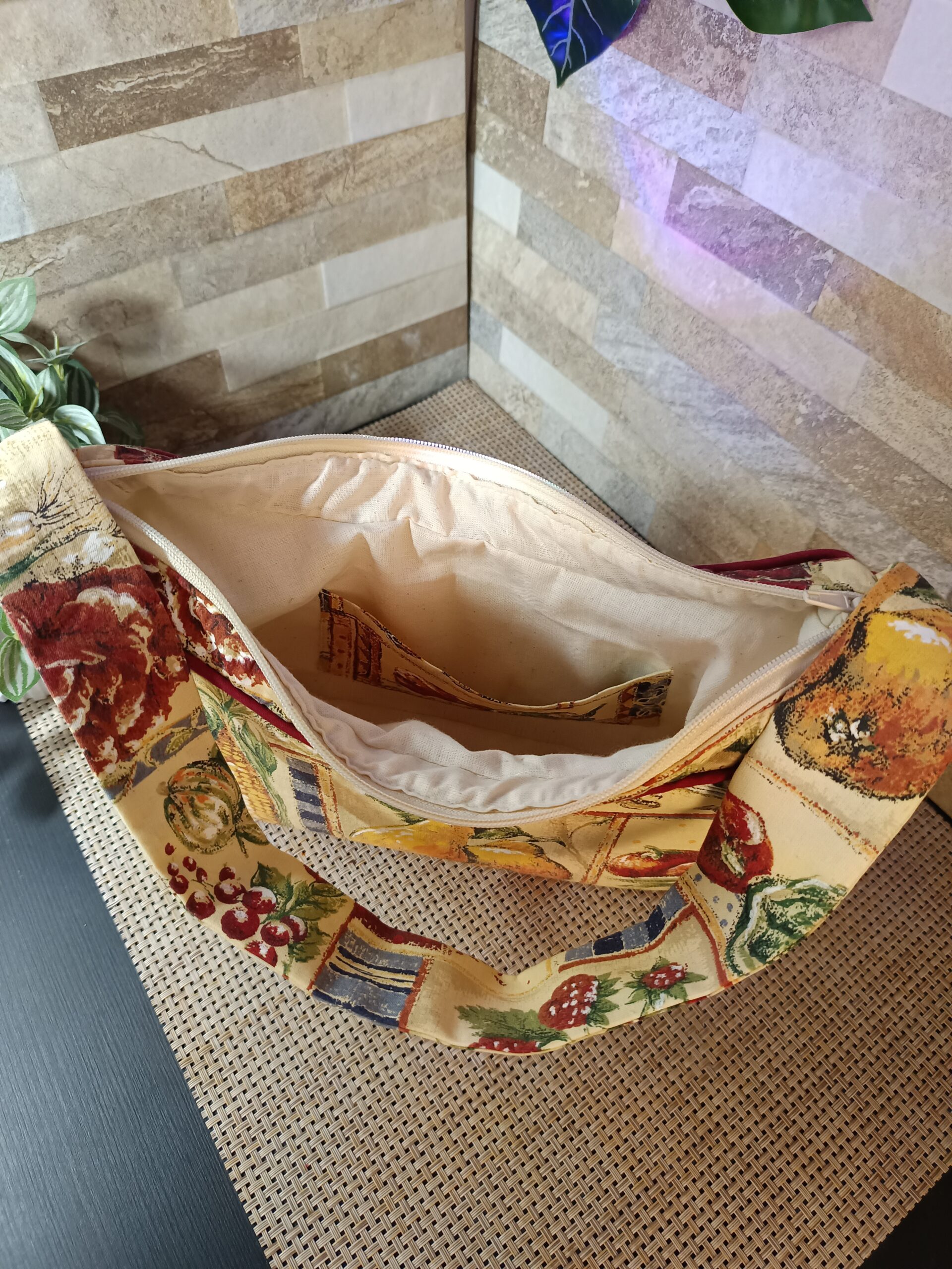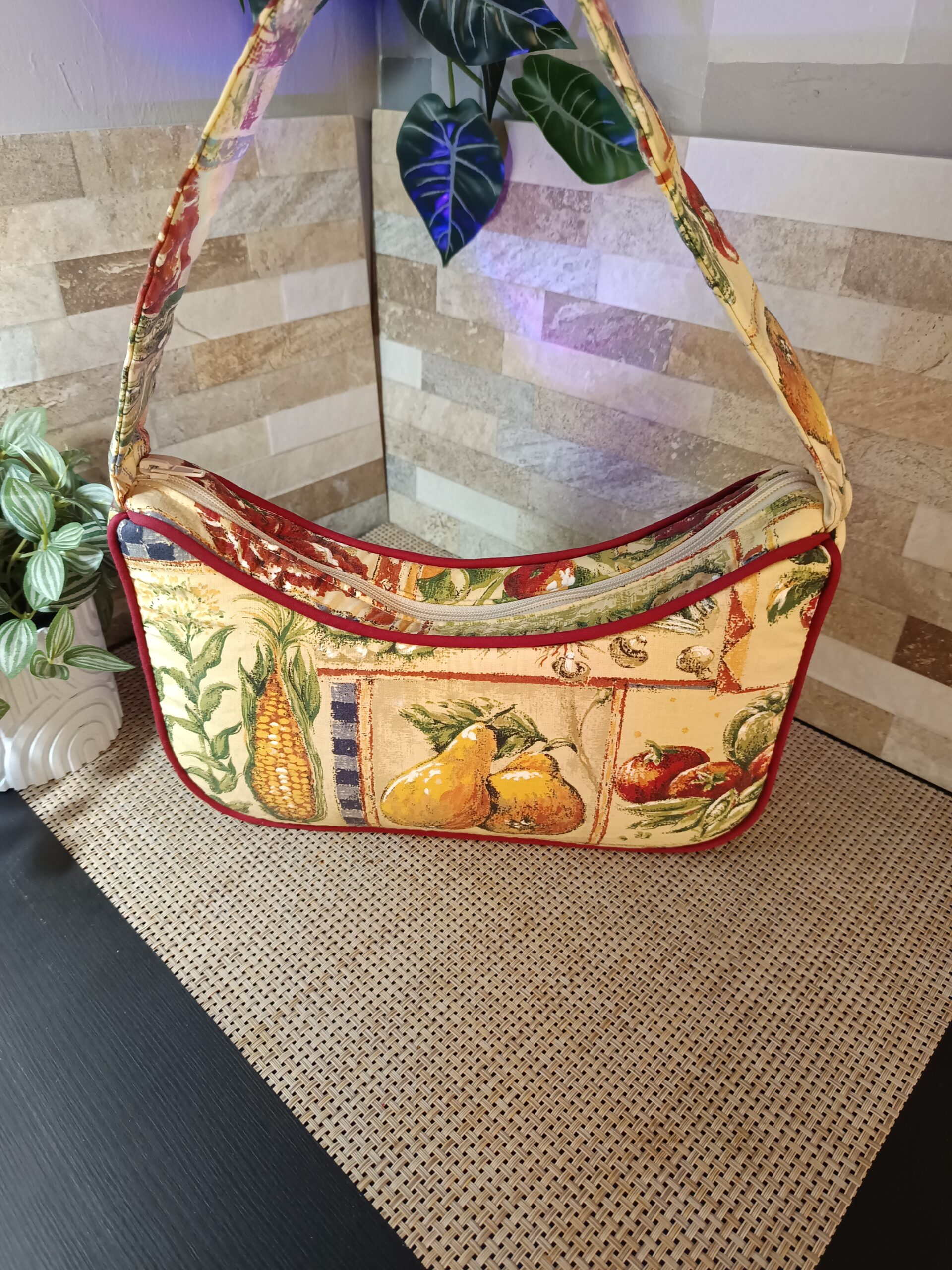 Sac Luna de ville compact, motifs fruits/légumes, bordé d’un passepoil finition couture.