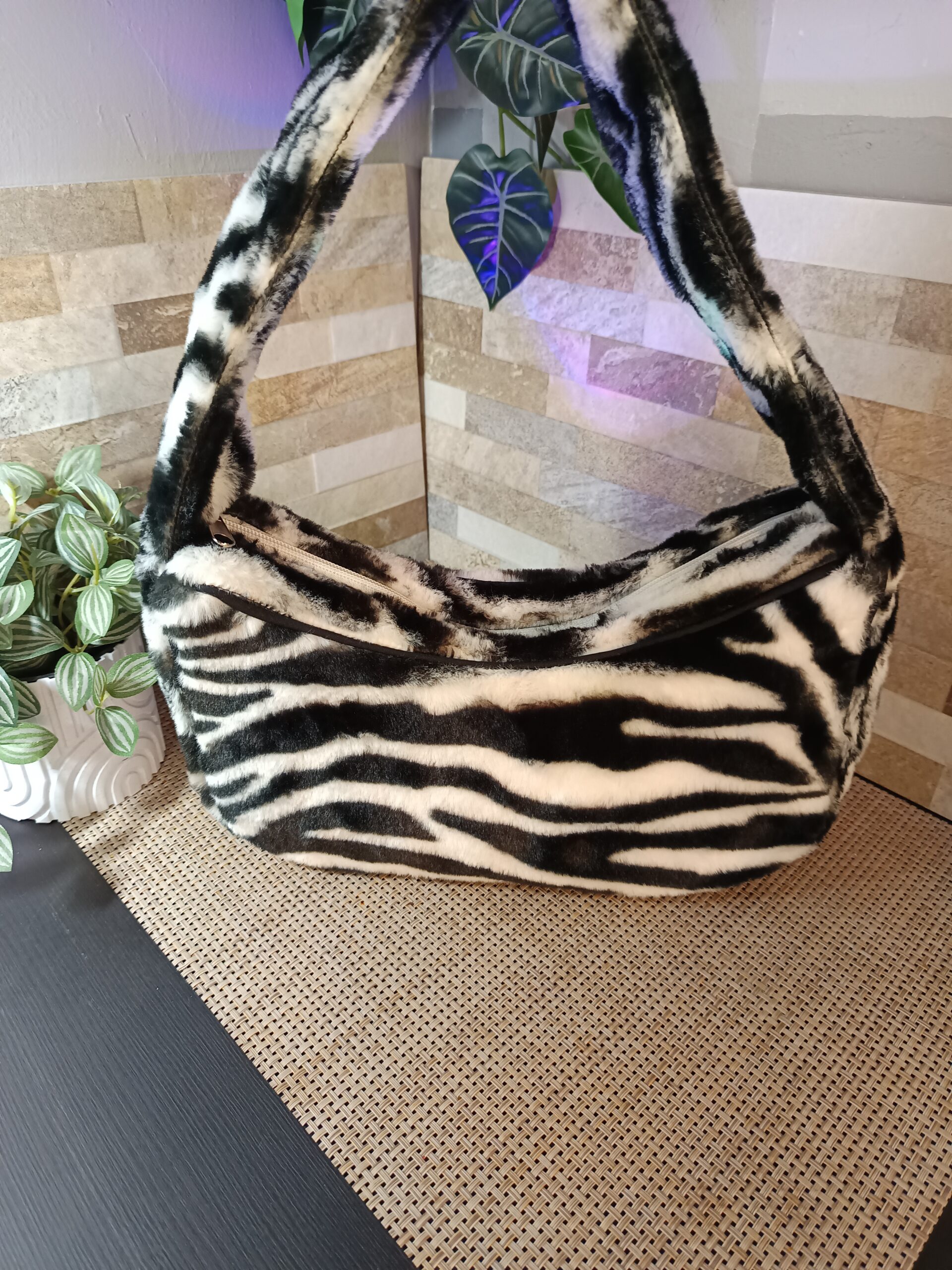 Sac Luna de ville compact en imitation zèbre, bordé d’un passepoil finition couture.