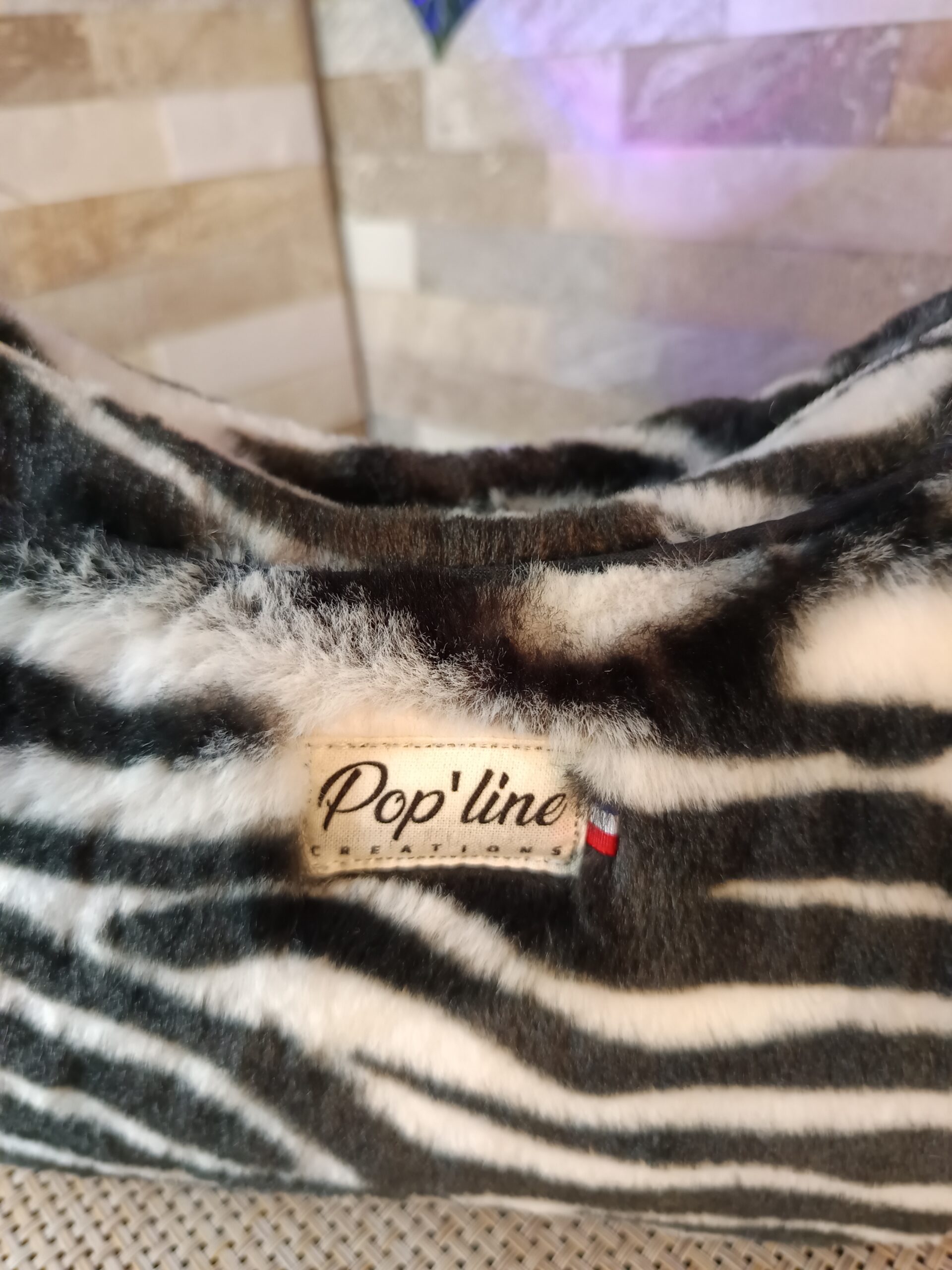 Petit sac de ville très structuré qui a une bonne tenue grâce à ses renforts. Il est bordé d’un passepoil assorti qui lui donne son chic, finition  couture. Il est entièrement doublé en satin uni et comporte une poche plaquée sur un côté intérieur. Confectionné dans tissu imitation zèbre, il est lavable en machine.