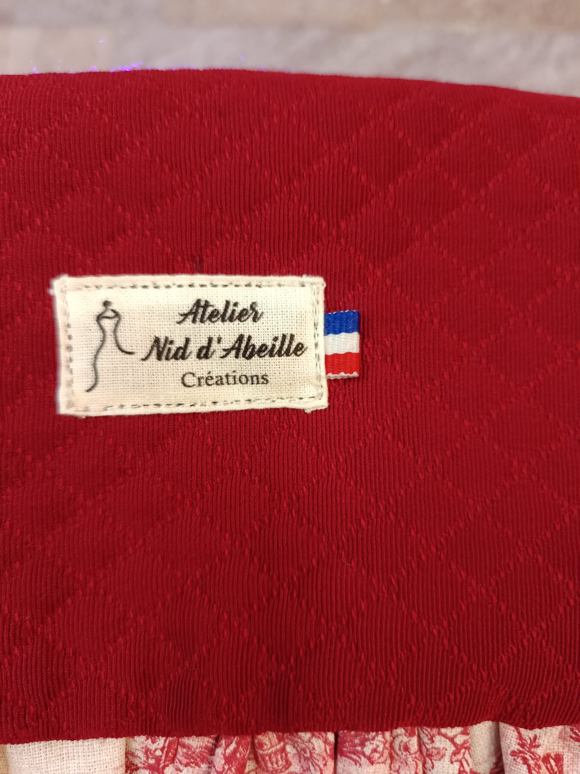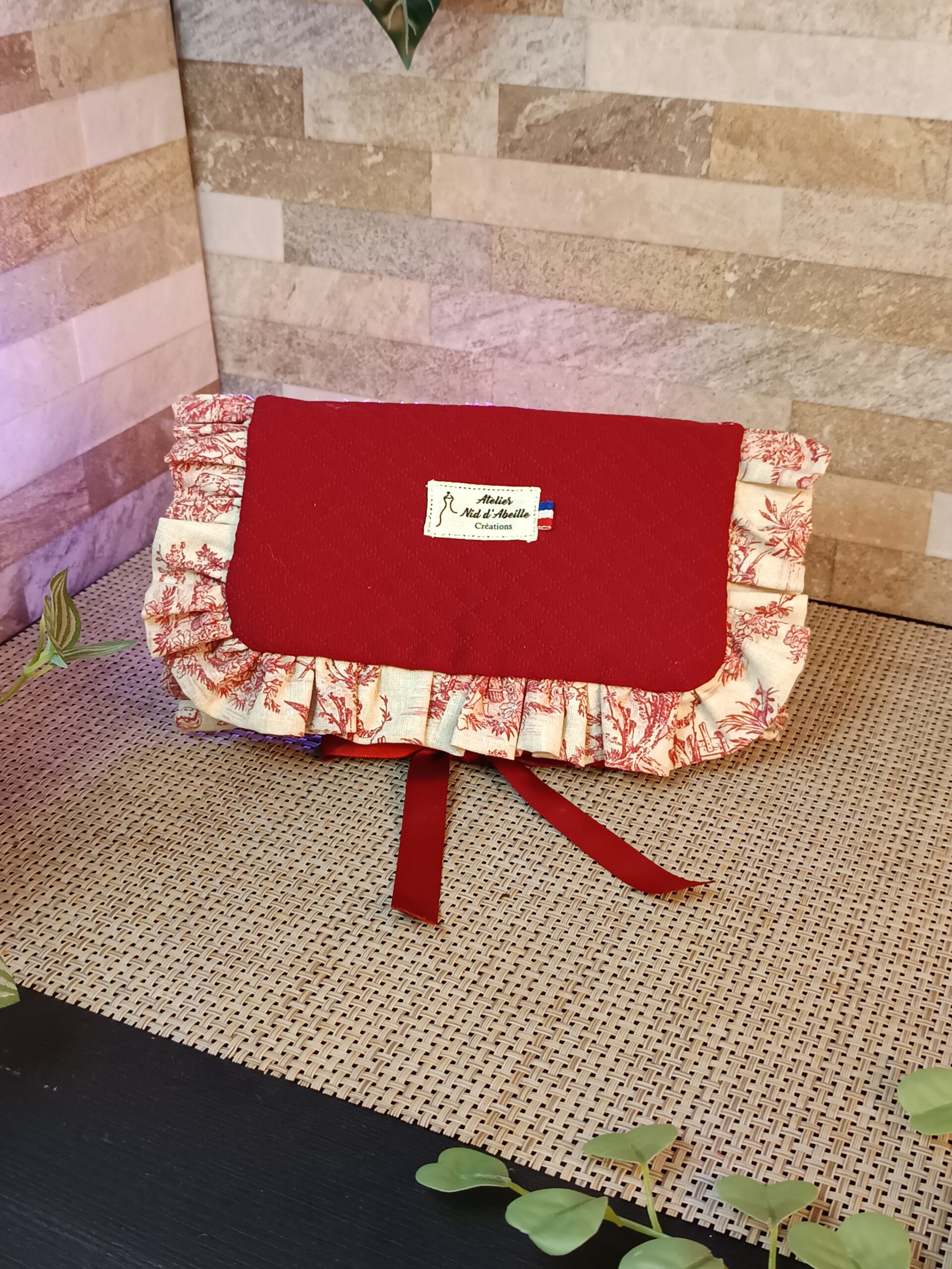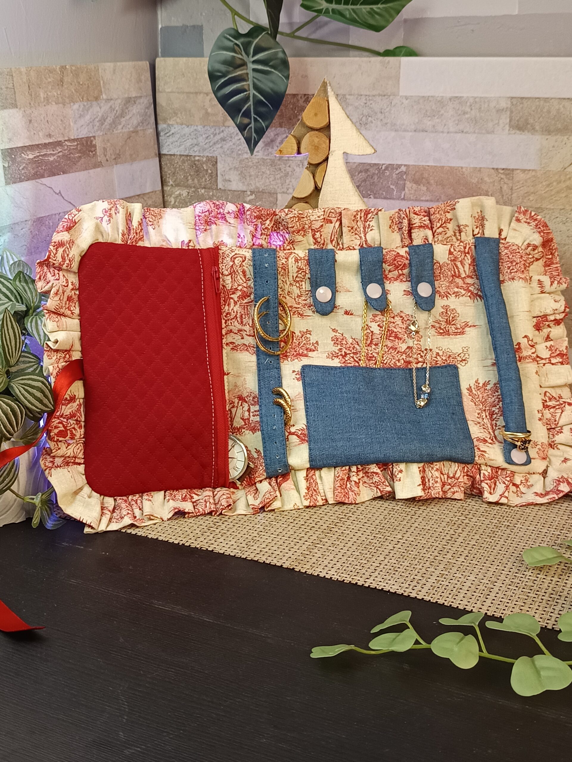 Trousse à bijoux en piqué de coton bordeaux à l’extérieur, détourée d’un volant en toile de Jouy. L’intérieur est doublé en toile de Jouy pour le fond et de jeans pour les différents supports. Elle se ferme grâce à un ruban satin.
