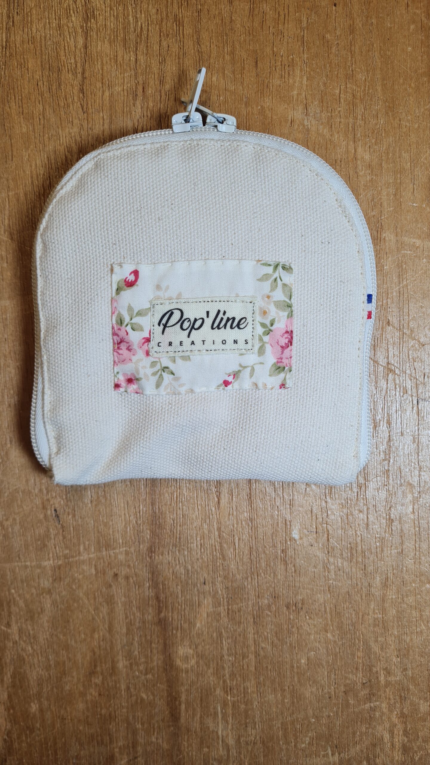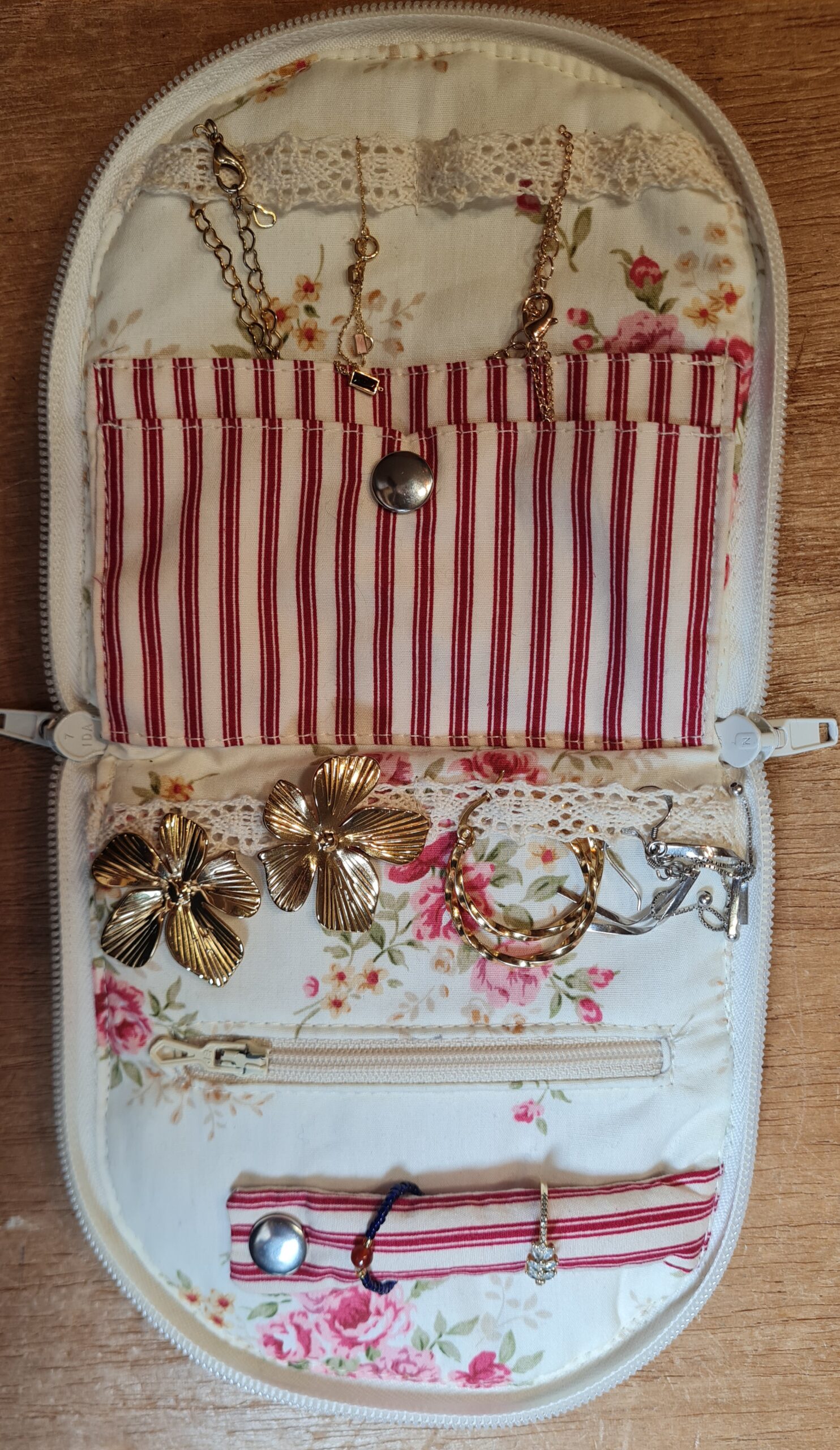 Trousse à bijoux, petit format en lin écru. L’intérieur est doublé de tissus coton, un rayé et un fleuri anglais. Elle se ferme grâce à une fermeture à glissière.