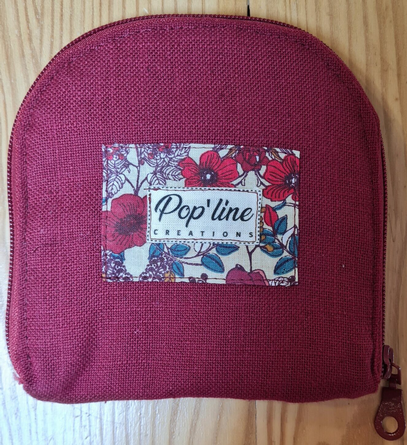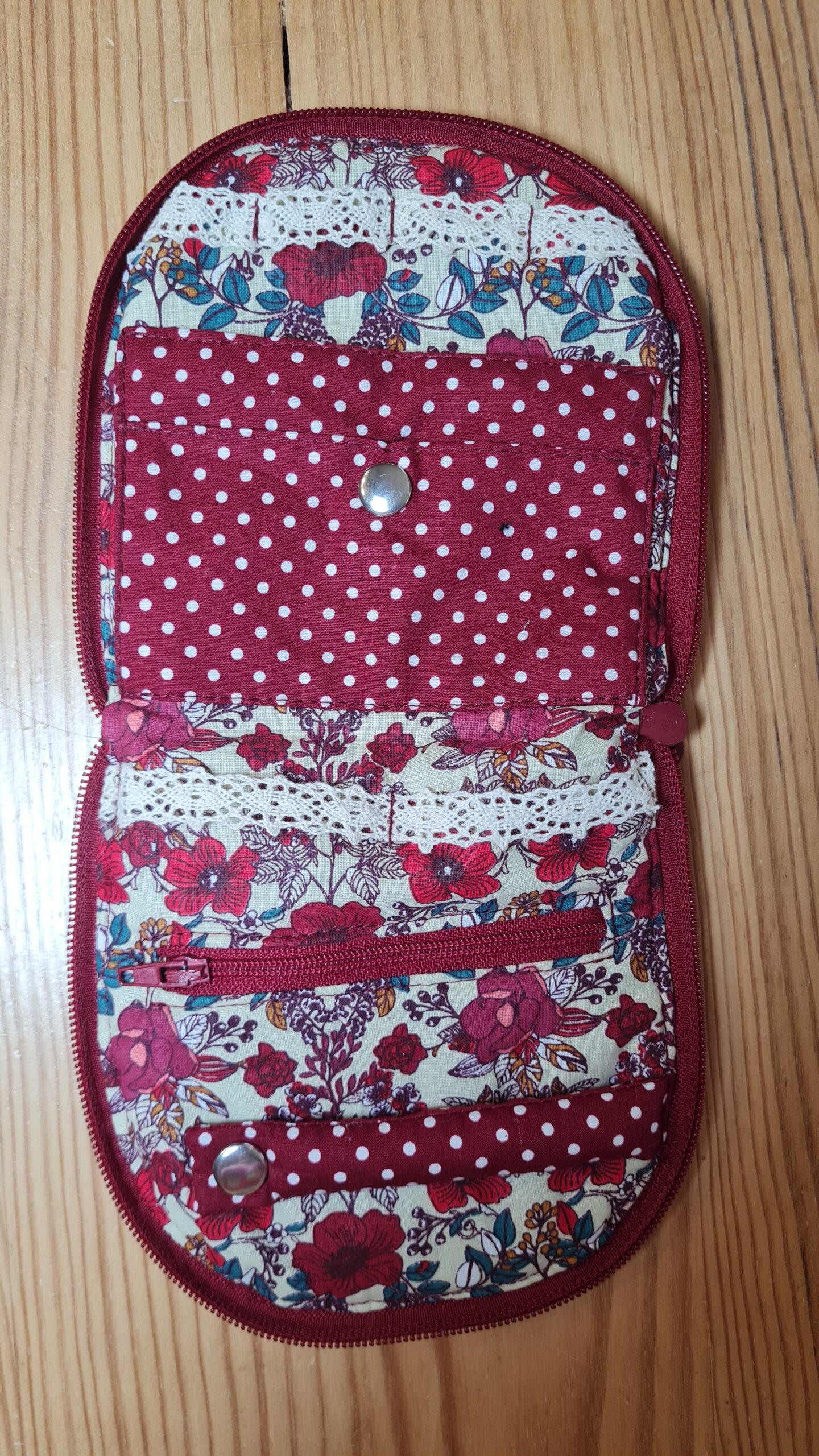 Trousse à bijoux, petit format en coton bordeaux à l’extérieur. L’intérieur est doublé de tissus coton, un à pois et un fleuri. Elle se ferme grâce à une fermeture à glissière.