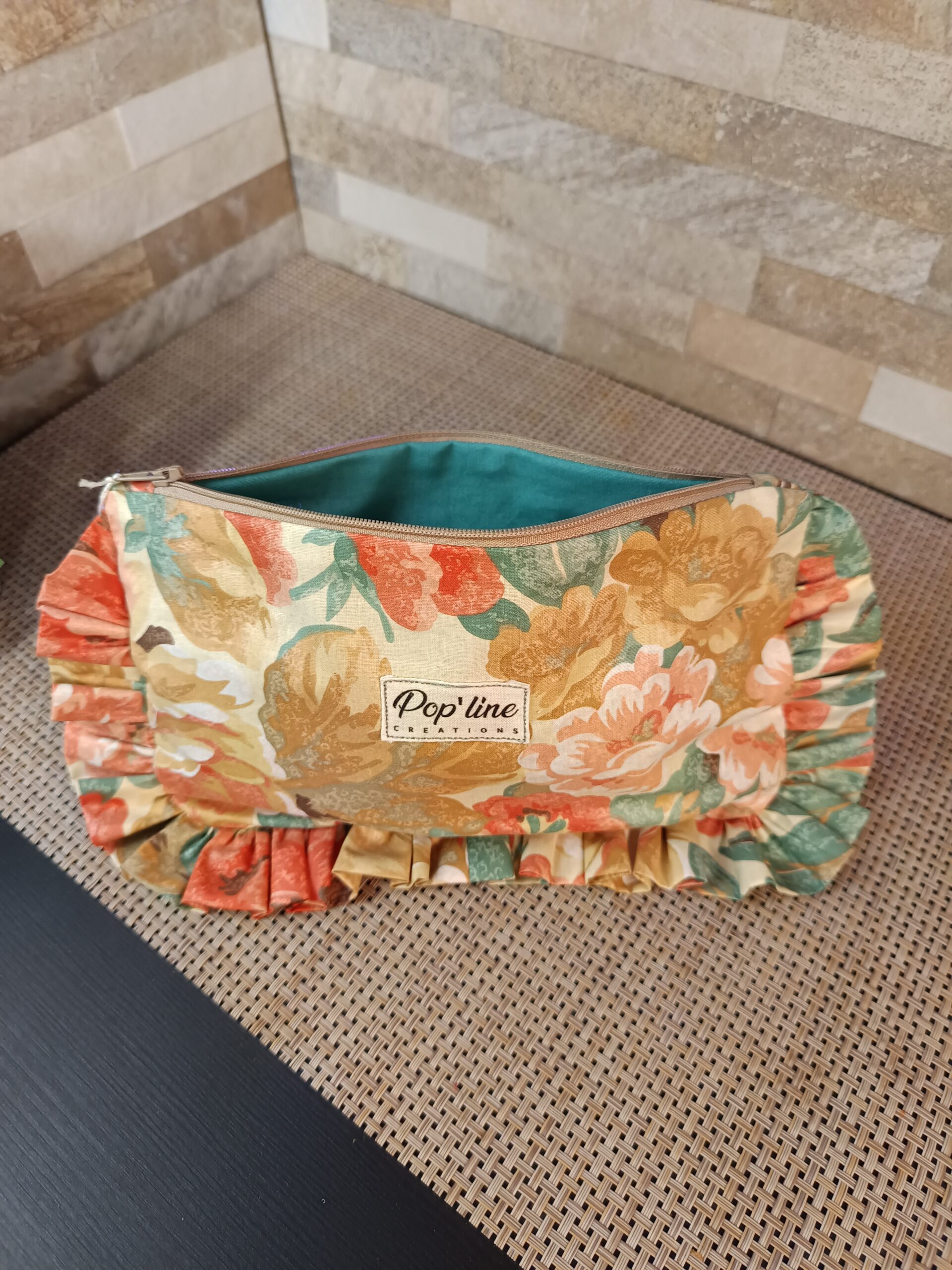 Trousse en tissu fleuri vintage, détourée d’un volant dans le même tissu. L’intérieur est doublé dans un tissu vert d’eau. Elle se ferme grâce à une fermeture à glissière.