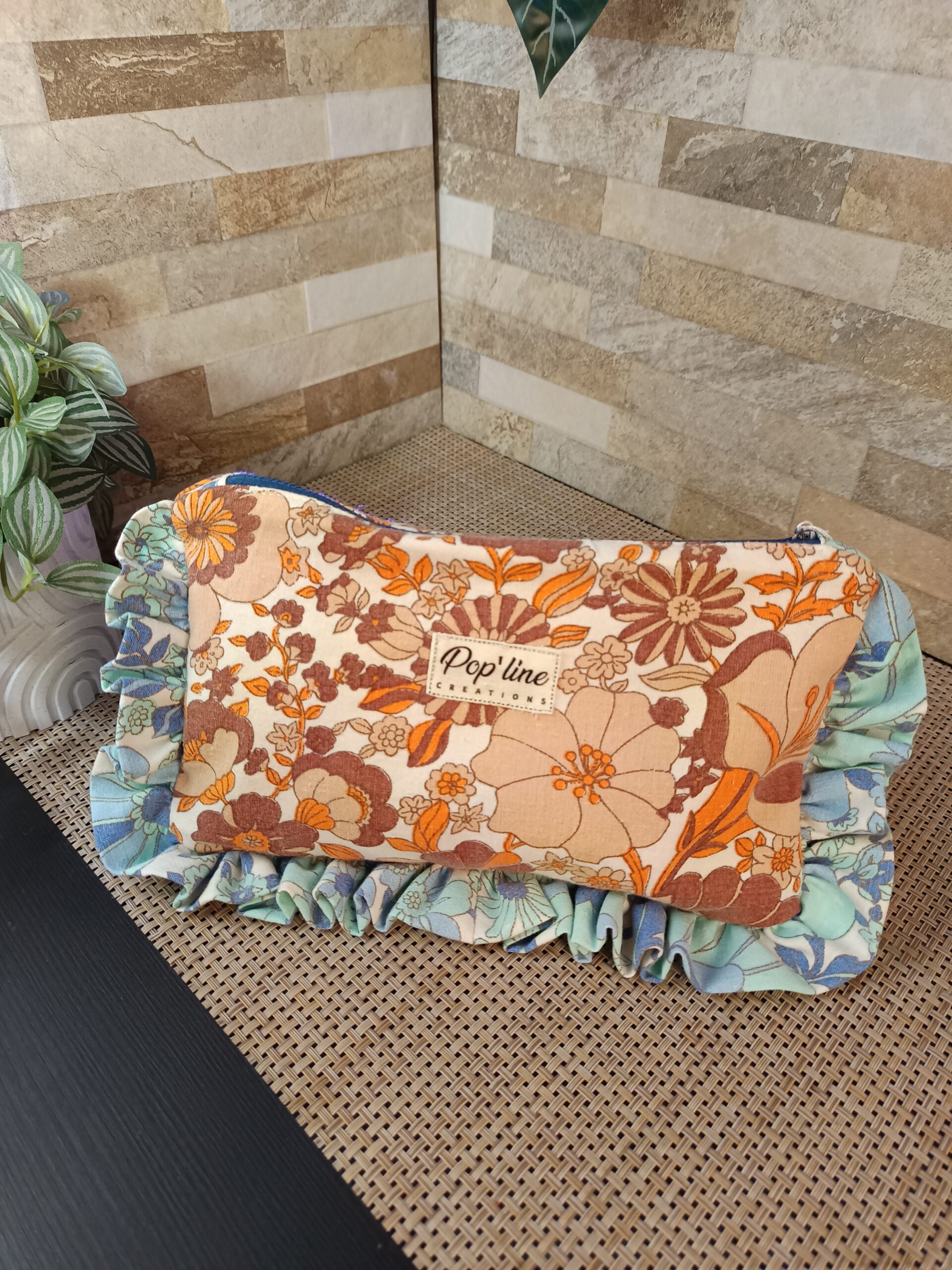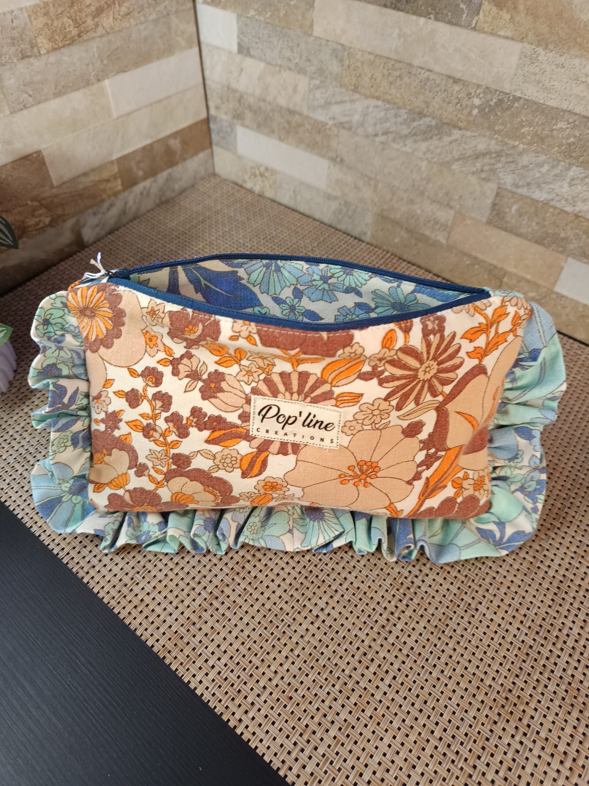 Trousse en tissu upcyclé fleuri marron, détourée d’un volant dans le même motif mais bleu. L’intérieur est doublé dans le tissu fleuri bleu. Elle se ferme grâce à une fermeture à glissière.